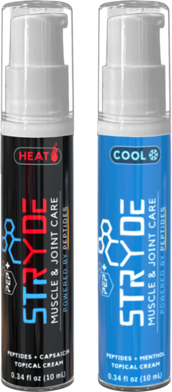 PEP+ STRYDE is a dual-cream topical system that uses bioactive peptides and active ingredients to support joint comfort, mobility, and muscle recovery. Both versions—Heat (Fire & Ice) and Cool (Icy)—are fast-absorbing and non-greasy, formulated for use before or after physical activity, or as part of a daily wellness routine.